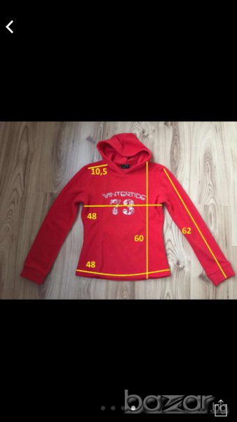 Детски полар НОВ, неизползван, червен, ръст 164, отпред надпис със сребърен брокат. Топъл подходящ за ски или за студените зимни дни. Размерите са на последната снимка.