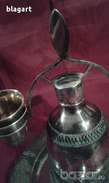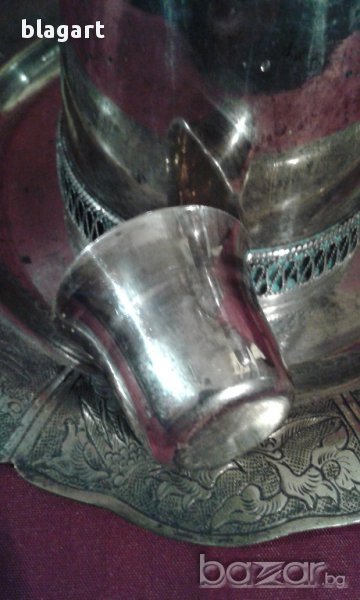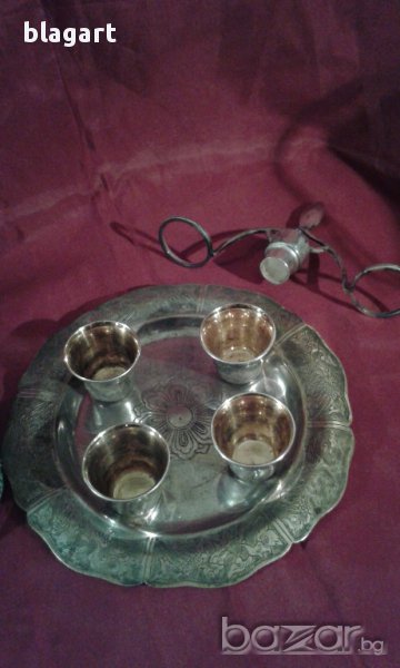 Много оригинален посребрен съд за ликьор,ракия и др. с 4 бр. малки чашки и подносче. Чашките са идеални за ликьор, греяна ракия. Произход-Русия.