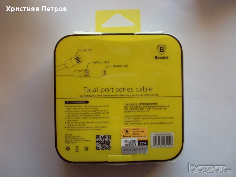 Продавам двоен USB кабел Baseus. Кабел-а е с Apple USB за iPhone и Micro USB за всички останали модели телефони. Дължината му е 1 метър.