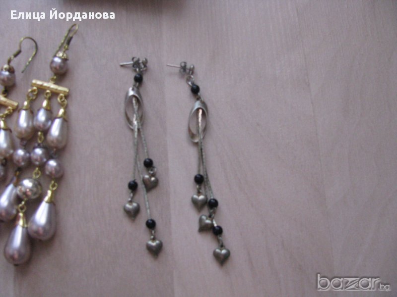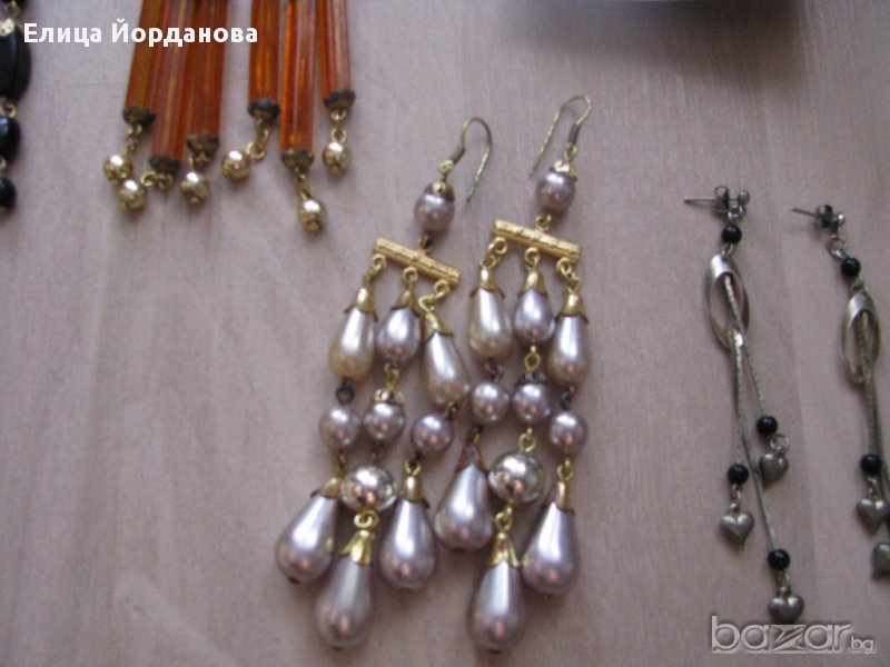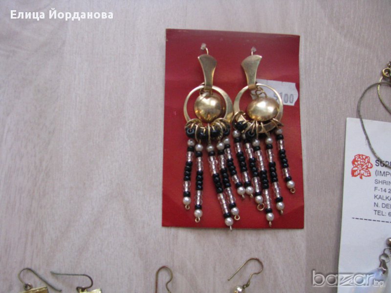 Висящи обици-различни видове, нови са тези върху червената подложка, другите са слагани по един път. Цената на обиците е за брой.