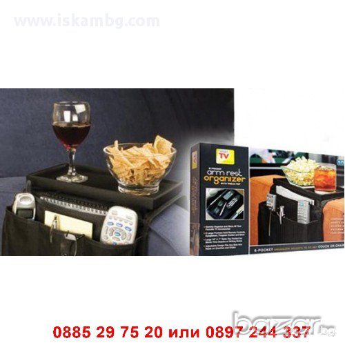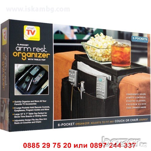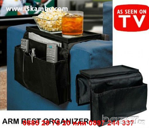 Органайзерът Arm Rest e идеалното допълнение към дивана във всеки дом. С шест вградени отделения, тозиуниверсален органайзер събира вечно разхвърляните списания и дистанционни, очила и други вещи чисти и спретнати точно до любимото ви място. Органайзерът също така разполага с твърда горна част, която може да се ползва като масичка, идеална за храни, напитки, водене на записки и др.