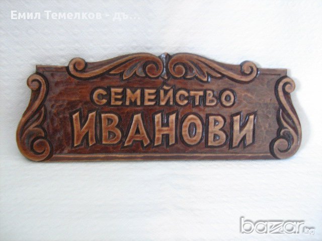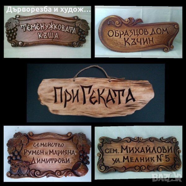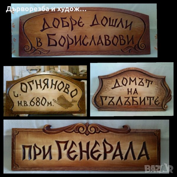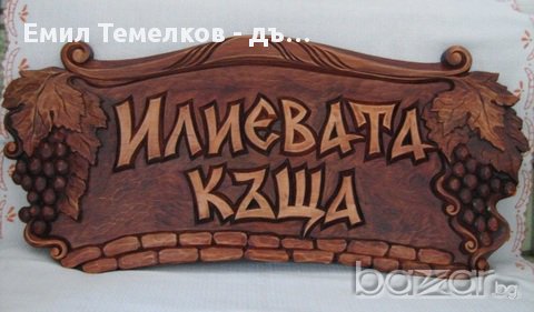 Изработвам дървени табелки за входни врати, улици, заведения, хотели, къщи, за сувенири и др. с и без орнаменти (дърворезба). Цвят, модел и големина по желание.