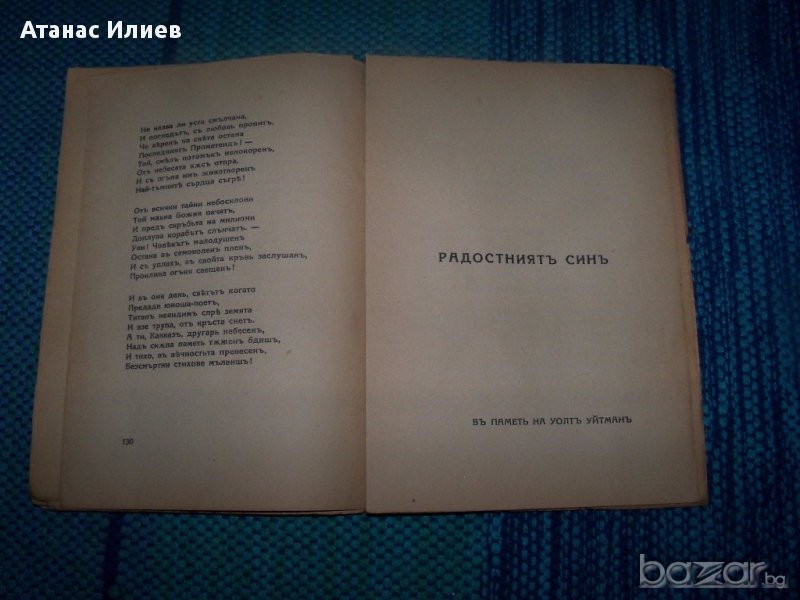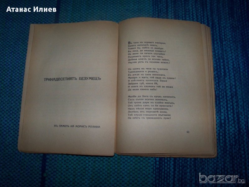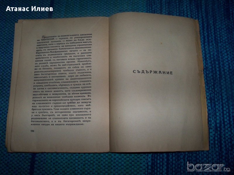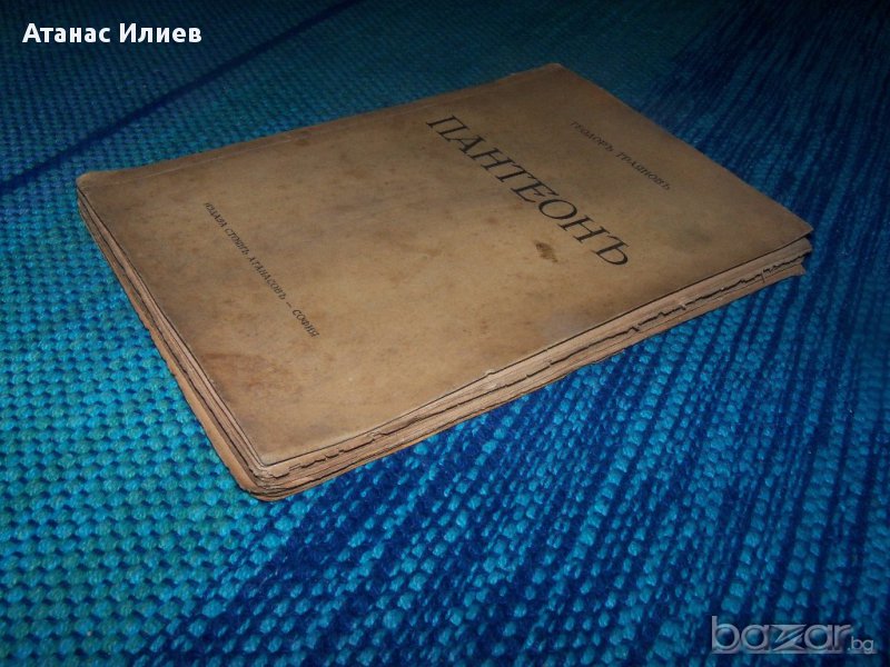 "Пантеон" от известния български символист Теодор Траянов, смятан за един от родоначалниците на българския символизъм. Книгата "Пантеон" е въплъщение на житейското и творческото му кредо – победа на духа над материалния живот – поетична апология на избраниците на духа, одически химн на световни и български прокълнати поети, оригинална по замисъл и артистично превъплъщение антология. Книжката е с меки корици, 160 стр. издание 1934г.на книгоиздателство Стоян Атанасов, София. Част от страниците се отделят от книжното тяло, няма липсващи страници.