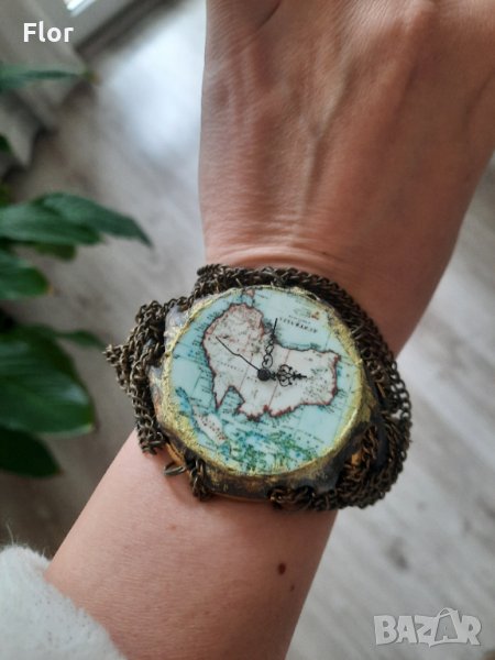 2. Стиймпънк гривна с част от картата на света, с часовник, който е само декоративен. Едната стрелка е леко изкривена. Вижда се на снимките. Уникат. Носена.