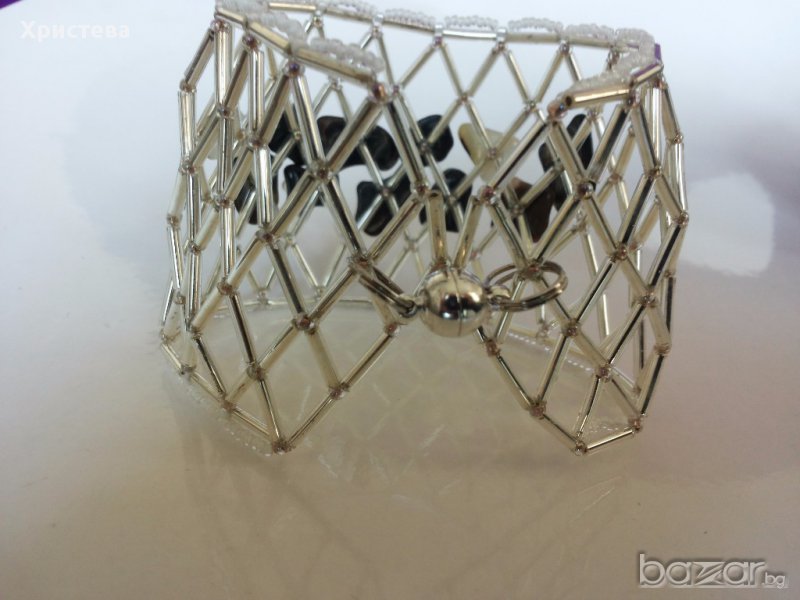 Гривната е изработена от мъниста тохо тръбички- сребристи,седеф,естествени перли.Широка е 5 см.,дължина-18 см.С метална магнитна закопчалка.