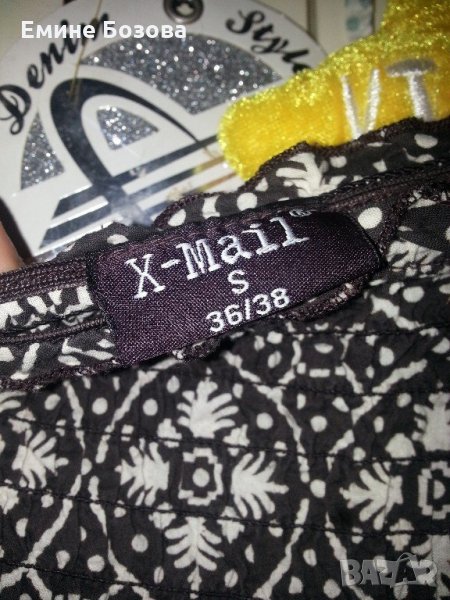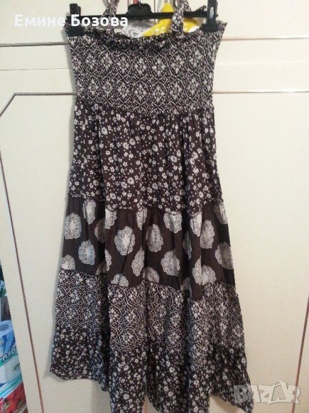 2.Кафяво шарена рокля X- Mail,S 36/38 на волани,имало е ластик на гърдите,тънки вързанки на раменета г 35 т 46 х 57 дълж.107