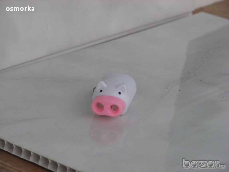 Малък ключодържател във формата на симпатично прасенце с двойна светлина, за лесно уцелване на ключалката за осветяване на стълбите и за всякакви други цели.