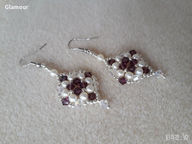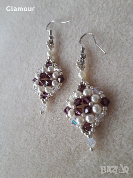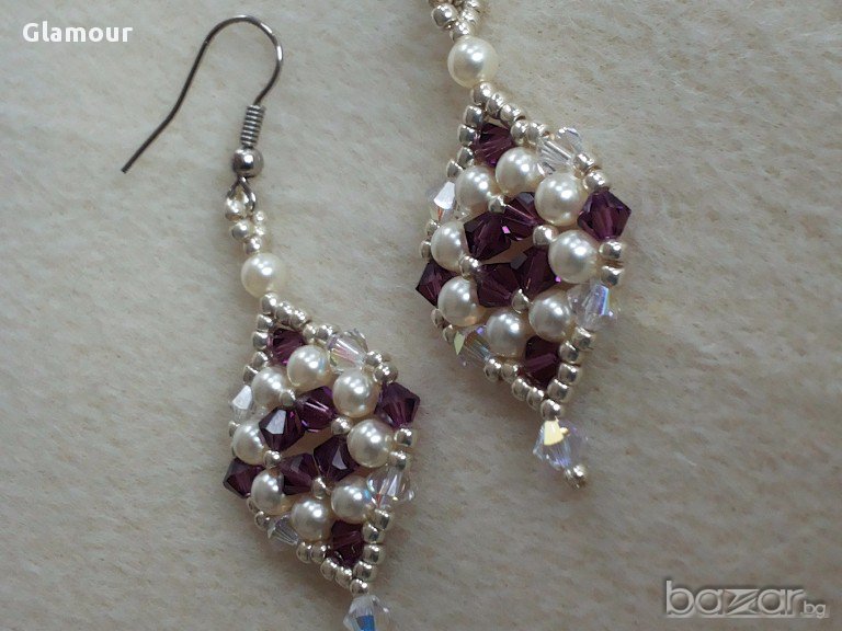 Обеците са тип ориенталски,направени с елементи на Сваровски-перли/цвят крем/,кристали/цвят аметист/и мъниста тохо-сребристи.Кукичките са метални.Дължината на обеците,заедно с кукичките е 5,7 см.,ширина 2,2 см.