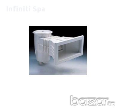 Скимер за басейн с широк отвор, Astralpool. Изработен от бял ABS с безшумен поплавък на преливника. Препоръчителен дебит 5куб.м./час. Връзки 1 1/2", 2". Размер на отвора - 415х230мм. Скимер за басейн облицован с керамика - цена 168,00лв.