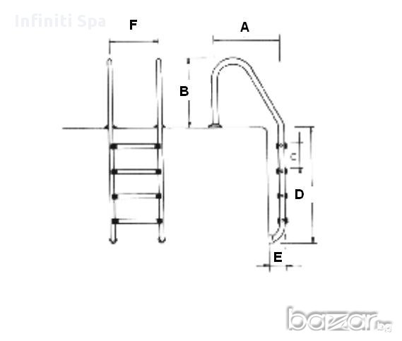 Стълба за басейн стандарт, Astralpool. Изработена от неръждаема стомана AISI-304, метални стъпала от нехлъзгащо покритие, без остри ръбове. Комплект анкери за вграждане в бетон. Подходяща за басейни с филтрация тип "скимери".