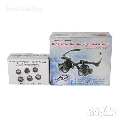 Часовникарска лупа за глава тип очила с LED осветление лампа голямо увеличение сменяеми лещи часовни