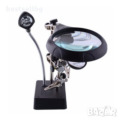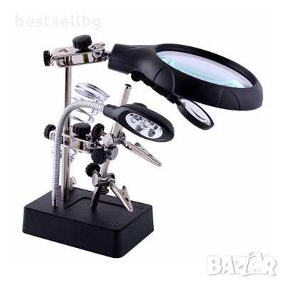 лупа с LED осветление, помощна ръка, чупещо се рамо с поставка за запояване и увеличения 2.5X 7.5X 10X