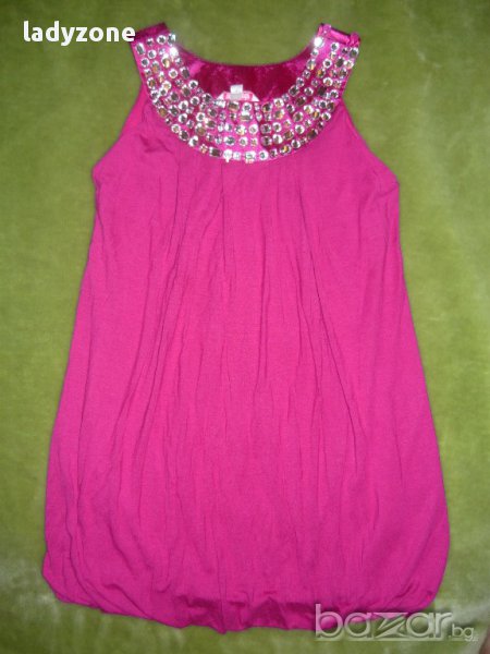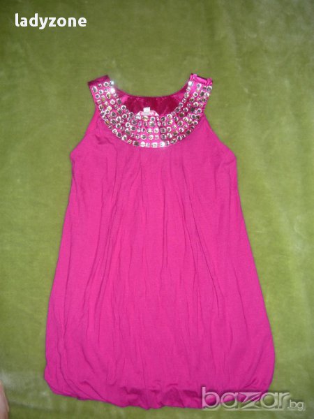 много готина детска туника . обличана е точно два пъти . в отлично състояние . материята е 100 % вискоза . подходяща за момиченца на възраст 8 - 9 години ( по етикет ) . закупена от Англия .