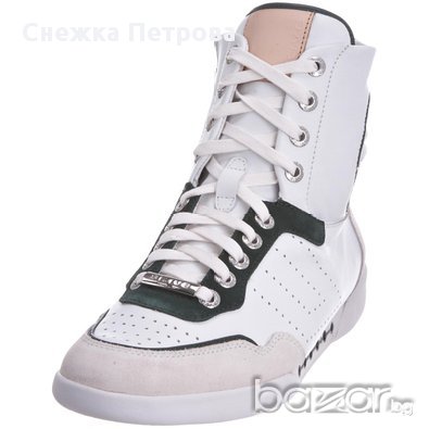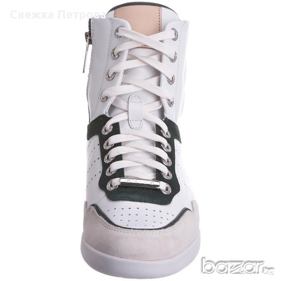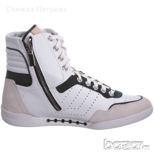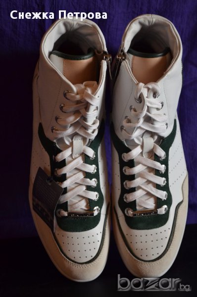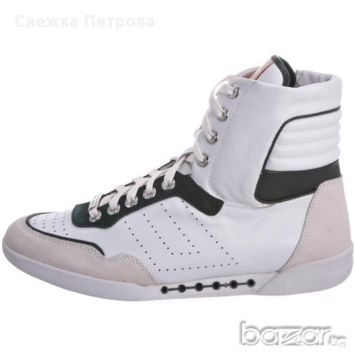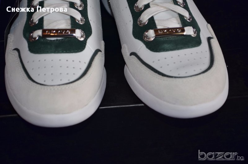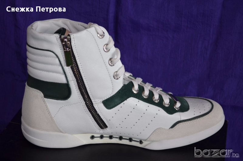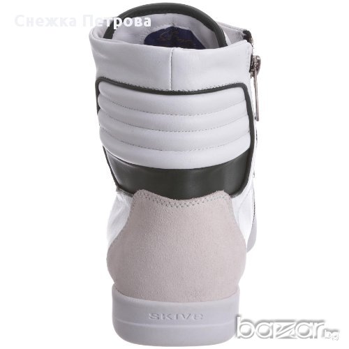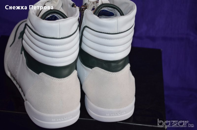 Чисто нови са с кутията и етикетите. Оригинални са на фирмата Skive а модела е Lever. Изработени са от естествена телешка кожа в бяло и тъмнозелено, отпред на пръстите и отзад на петата са с велур в светлобежов цвят. Освен връзки, маратонките имат и цип от вътрешната страна за по-лесно използване. Бяла гумена подметка със специално патентована двойна вентилационна система, която осигурява по-голям комфорт и хигиена на стъпалата. Лого на фирмата отпред на връзките и отзад на петата. Оригинална торбичка за маратонки.