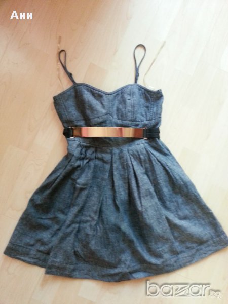 Много секси рокля в сиво.Деколтето е доста изрязано и подплътено за да може да се носи и без сутиен.Има гайки под бюста за широк колан.Надолу се разкроява.Презрамките се регулират.Стои много кукленско.Тъй като е доста къса може да се носи и като туника.Няма забележки.Размер С.