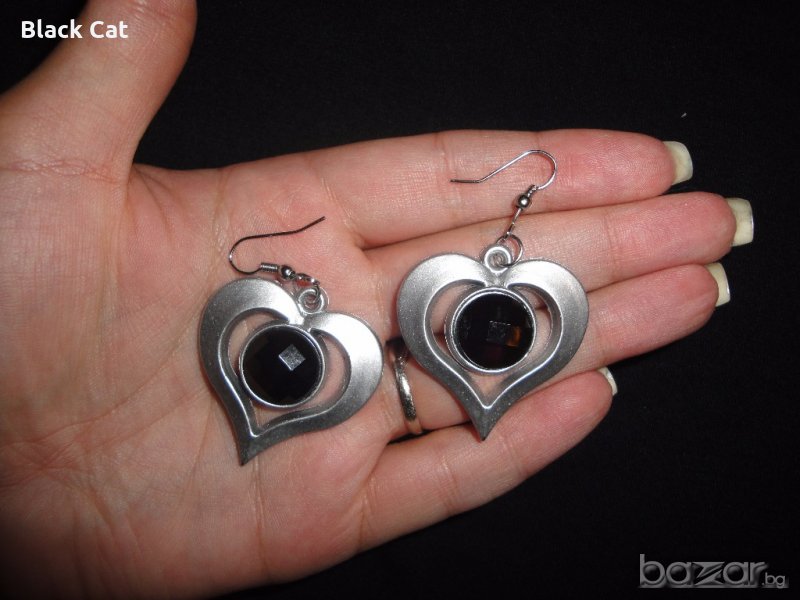 Описание: Дамски обици, под формата на сърца, декорирани с ефектни черни камъни / кристали
