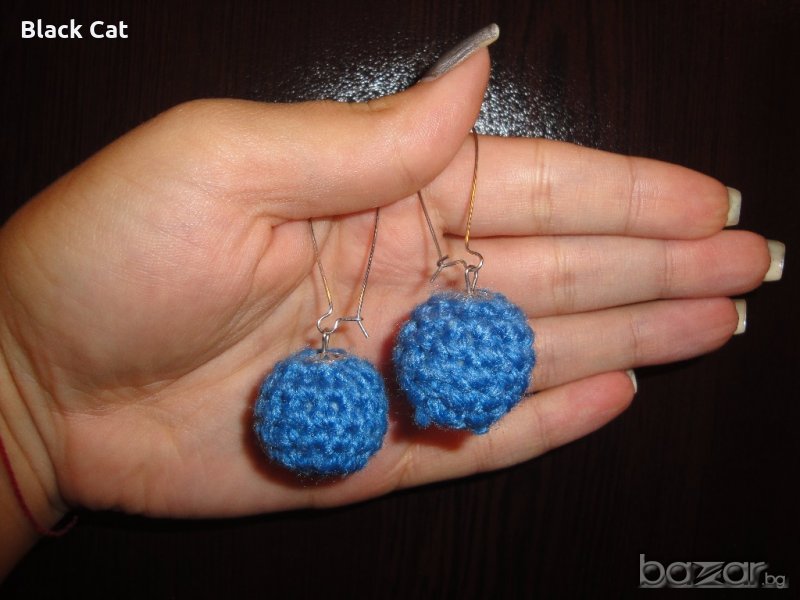 Размери: Дължина на обиците (включително кукичките) – 6 см, диаметър на топчетата – 2.5 см.