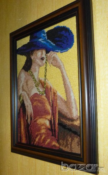 Ръчно изработен гоблен "Дама с шапка" в рамка с антирефлексно стъкло с размер на изделието 35/26см , подходящ за дома или за подарък.