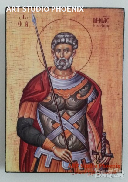 Репродукция на икона Свети Мина, избор на изображения, ръчна изработка (техника декупаж) върху дърво.