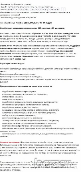 Подобрете качеството на чешмяната вода у дома с алкалния стик за пречистване на питейната вода с до 9.6 pH. Осигурете здраве за вас и вашето семейство! Този джобен алкален стик може да промени всяка чешмяна или бутилирана вода в здравословна питейна вода с качества на естествена минерална вода. Антиоксидант с висок PH, с по-малки и лесно усвоими биомолекули, с повишено съдържание на кислород. Пречиства, алкализира и създава водородно наситена антиоксидантна вода директно във вашата бутилка или чаша само за няколко минути!