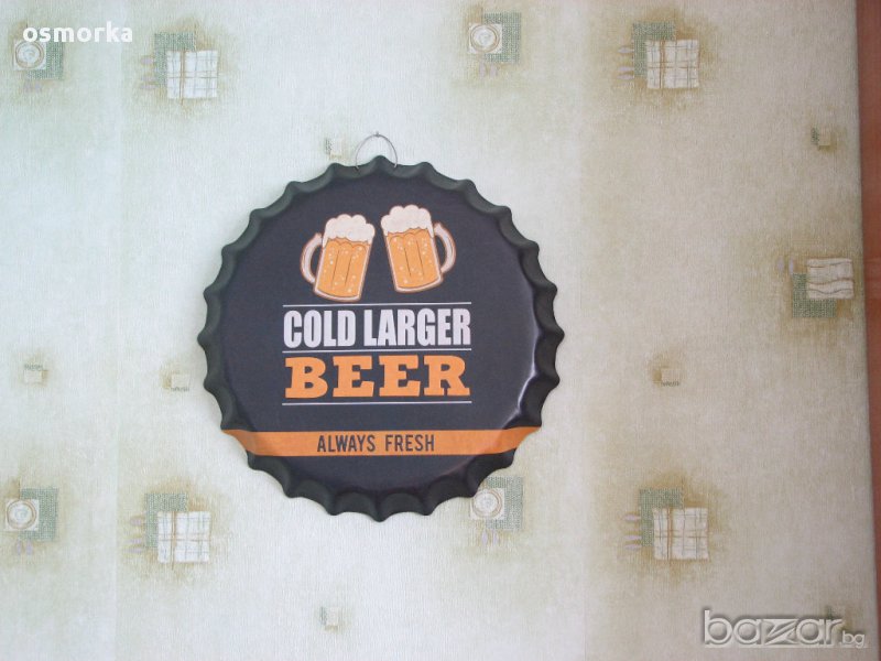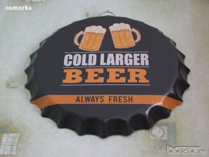 Голяма табела на две халби с бира във формата на капачка за бутилки.