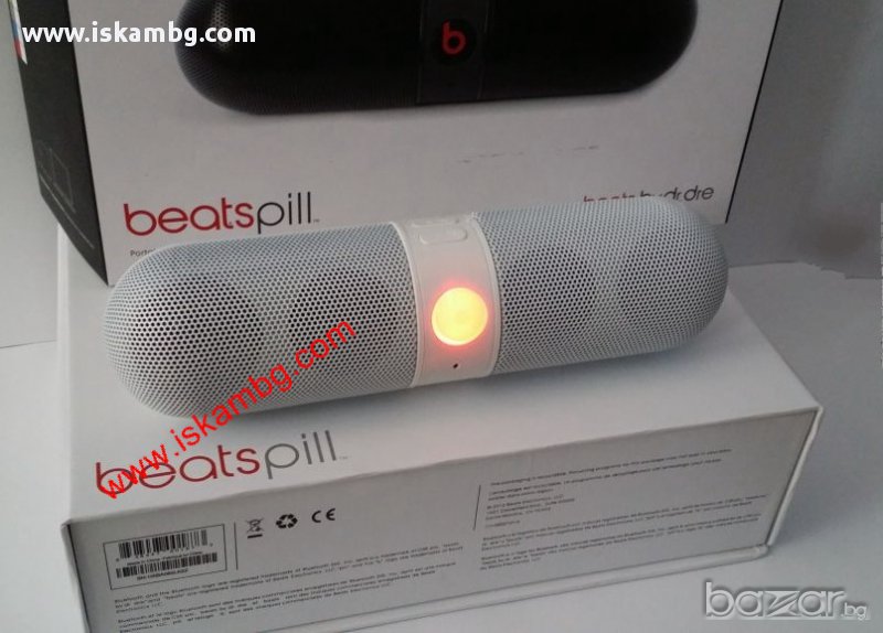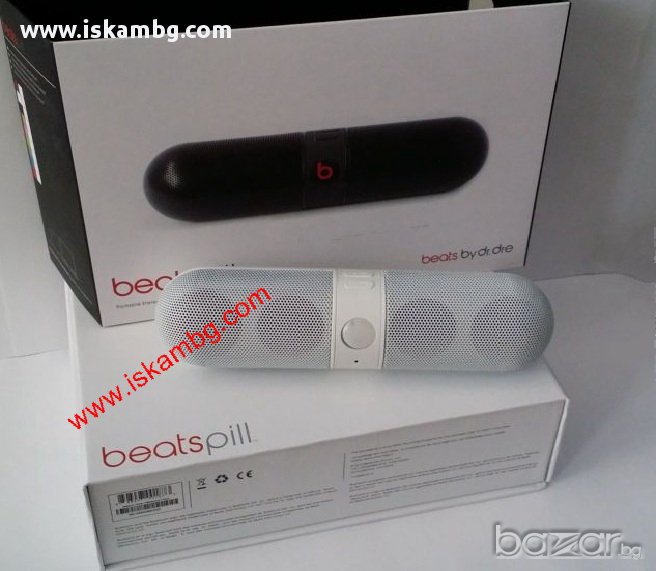 Предлагаме ви Безжична Bluetooth колонка Dr.dre Beats Pill. Обхват: до 10 метра. Поддържа SBC, APT-X и AAC Bluetooth, което означва че ще получите доста по-качествен звук от всяко едно друго Bluetooth устройство. Може да сменяте песните директно от вашия iPhone, мобилен телефон, лаптоп или друго устройство с Bluetooth. Вграден микрофон за безжични разговори. Line out за свързване с външни систем. Aux input за свързване с устройства с 3.5 мм аудио кабел. Мощна и точна аудио технология за максимален звук с минимално изкривяване. Подсилен и портативен дизайн Работи с презареждаща се литиево-йонна батерия (вградена) или с ток от ел. мрежа. Зарежда се лесно с USB кабела в комплекта. Вграден микрофон за безжични разговори. Налични цветове: Черен, Червен, Бял. Комплектът съдържа: Beatbox™, Pill аудио система, USB 2.0 кабел, 1.5 m аудио кабел (3.5mm към 3.5 mm), Захранващ кабел.
