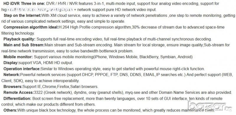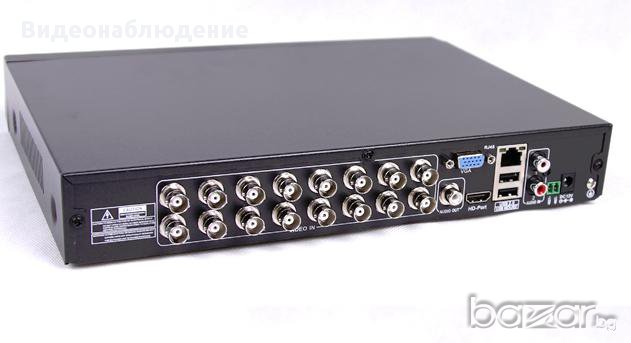 16 канален 960H/AHD-M/720P/1080p/1080N AHD NVR DVR Поддържа най-новата серия 960H/AHD-M/720P/1080P/1080N последен модел видео камери от 2016г. с кодиране в реално време.Поддържани видео изходи: VGA, HDMI HDСъс защита от късо съединение, предпазител с уникална тройна защитна функция.Той може да се свърже със следните модели камери:Аналогов режим: 16 * нормални аналогови камери с висока резолюция от AHD-L/AHD-M/960Н/900/1000/1200 тв линииСмесен режим : 8*AHD-L/960H/720P/1080P/AHD-M камери + 8*960H камериХибриден режим: 8*960Н/AHD-M/720P/1080P камери + 8*720P/1mpx IP камериAHR режим: 16*720P/1080P AHD-M камериМрежови режим: 1*1080P + 8*720P или 4*1080P или 20*720P/1mpx Ip камериРезолюция на екрана: FULL HD 1920x1080 60Hz Cloud Technology: Облачната технология позволява да виждате двр-а и съотвено камерите, вързани към него от всяка интернет точка от цял свят и от всеки смартфон от цял свят, без да имате реално ай-пи и някакви специални настройки, без значение зад какъв Firewall седи устройството! (P2P Cloud функция)Поддържа: Symbian, S60v3/V5, Windows Mobile, Iphone, Android, BlackBerry - преглед на видеото чрез смартфон на живо през 3GЕзици на менюто: Български, Английски, S-китайски, T-китайски, италиански, испански, японски, руски, френски, немски, португалски, турски, полски, румънски, унгарски, фински, персийски, Тайландски, гръцки,