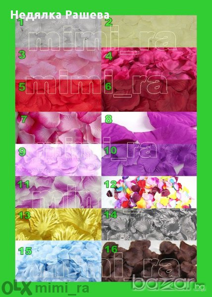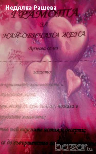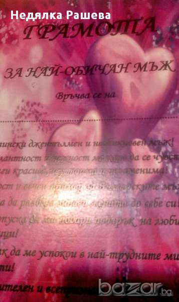 1.Грамота за най- обичан\а мъж\жена - 3 лв 2.Пухено сърце 15\12 см -4 лв 3.Изкуствени листа от роза 100 бр.-5 лв 4.500 бр. изк. диаманти 4,5 мм - 7 лв 5.Чаени свещи Романтика-6 бр-3 лв