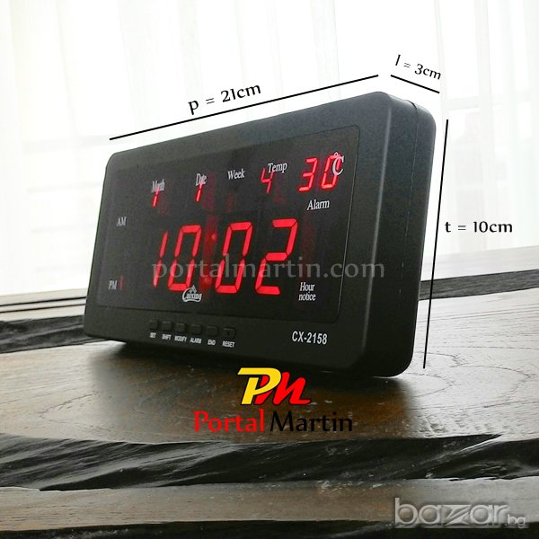 DIGITAL стена часовник CX-2158 LED електронен часовник CX-2158 с големи цифри.Показва час, дата и температура. Тип:LED електронен часовник Модел: CX-2158 Захранващо напрежение на часовника: 9VAC Захранващо напрежение на адаптера: 220VAC Технически характеристики: Възможност за нагласяне на:час,дата,месец,година и 8 аларми 12/24 часов режим на работа Отчитане на околната температура Бутон "RESET" за връщане към фабричните настройки Размери(ДхШхВ): 215X100X30MM