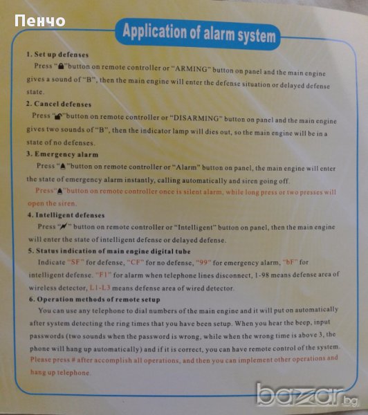 * Активиране на системата, след като затвори вратата, когато излязете. Дезактивиране на системата, преди да отвори вратата, когато се върнете.