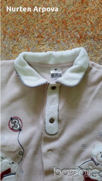 плюшен гащеризон на Карамел за 6м.възраст.като чисто нов е тъй като сме го слагали точно 2пъти.цвета е мляко с какао а апликациите са бродирани. Моля разгледайте и другите ми обяви! При покупка на повече от една обява-договаряне на цената.