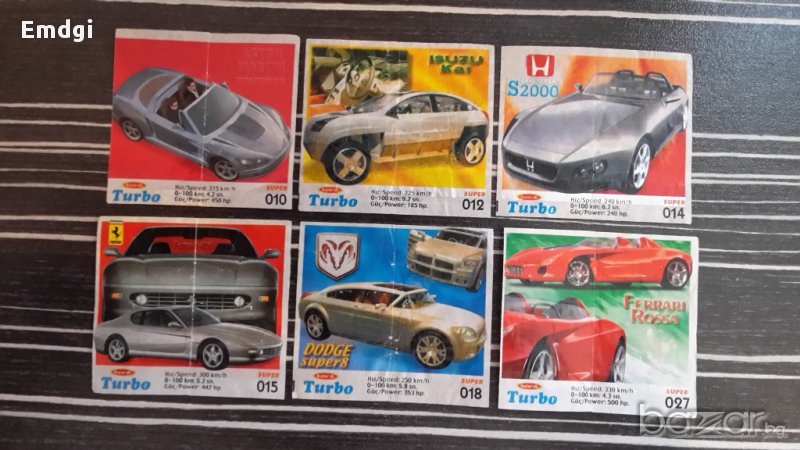 Колекционирам картинки от дъвки турбо, улфет, би биб, холидей и др. Ако имате картинки като тези от снимките или други, моля пишете ми или ми пратете снимки на лично съобщение или на емейла. Интересувам се също от опаковките на съответните картинки, от цели неотваряни дъвки и от техните кутии. Ако имате такива картинки или други, можете да ми пращате снимки на мейла [email protected] или да ми се обадите на посочения в обявата телефонен номер.