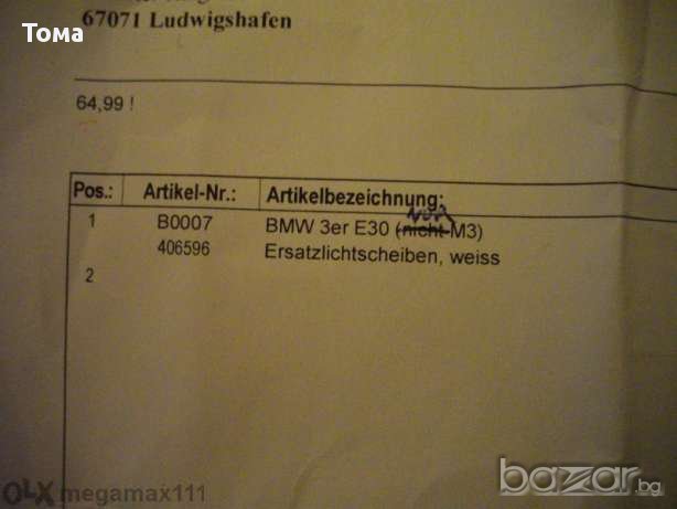 мигачите са закупени от сервиз BMW в Германия и са комплект с жълти капачки за крушката и габарити Закупени са за 65 евро.Вижда се от фактурата.