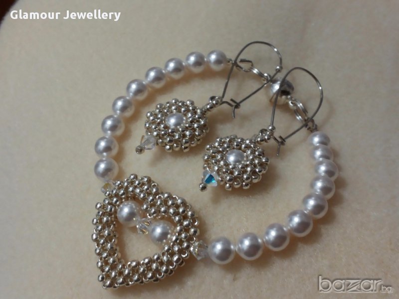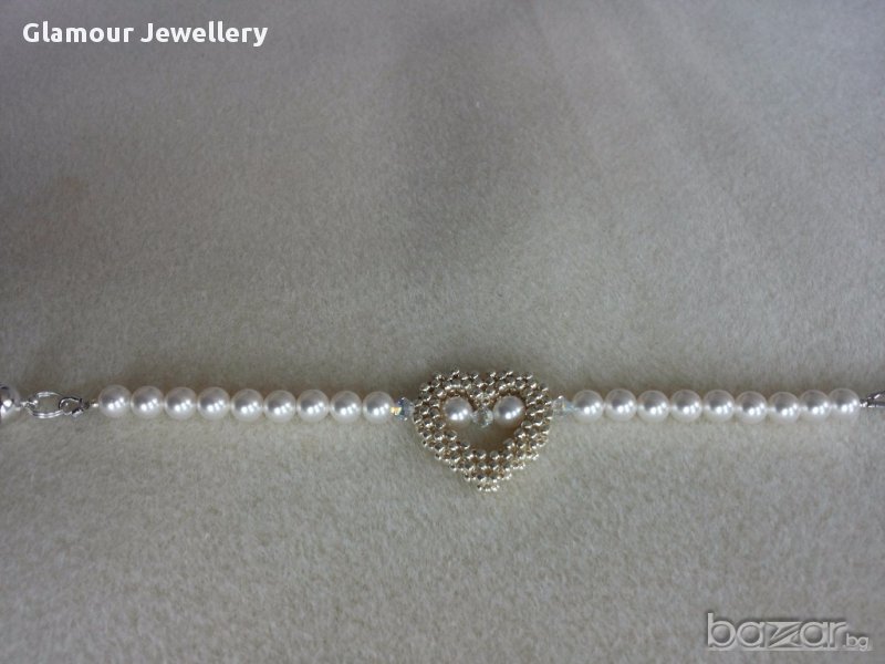 Гривната е изработена с бели перли на Сваровски,кристали и мъниста тохо.Закопчалката е магнитна метална.Дължина на гривната 18 см.Размерите на сърцето от мъниста са 2,5/2,7 см.