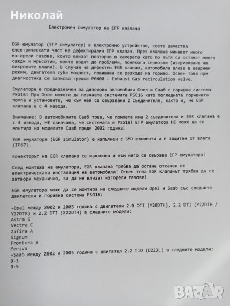 EGR ЕМУЛАТОР ЗА OPEL И SAAB EGR емулатор (ЕГР симулатор) е електронно устройство, което замества електрическата част на дефектиралия ЕГР клапан. През клапана минават много изгорели газове, които влизат повторно в камерата като по пътя си оставят много сажди и мръсотии, които водят до проблеми, понякога сериозни (изкривяване на вихровите клапи). В случай на дефектен EGR клапан, автомобила влиза в авариен режим, двигателя губи мощност, повишава се разхода на гориво. Освен това при диагностика се записва грешка P0400 - Exhaust Gas recirculation valve.Емулатора е предназначен за дизелови автомобили Опел и Сааб с горивна система PSG16! При Опел можете да познаете системата PSG16 като погледнете горивната помпа и установите, че към нея са свързвани 2 съединителя, както и, че EGR клапана е с 4 извода.Внимание: В автомобилите Сааб това, че помпата има 2 съединителя и EGR клапана е с 4 извода, НЕ означава, че системата е PSG16! ЕГР емулатора НЕ може да се монтира на моделите Сааб преди 2002 година!EGR емулатора (EGR simulator) е изпълнен с SMD елементи и е защитен от влага (IP67).Конекторът на EGR клапана се изключва и към него се свързва ЕГР емулатора!След монтажа на емулатора, EGR клапана трябва да остане откачен от електрическата инсталация на автомобила! Освен това EGR клапанът трябва да се затвори механично, за да не влизат изгорели газове!EGR емулатора може да се монтира на следните модели Opel и Saab със следните двигатели и горивна система PSG16:-Opel между 2002 и 2005 година с двигатели 2.0 DTI (Y20DTH), 2.2 DTI (Y22DTH / Y22DTR) и 2.2 DTI (X22DTH) в следните модели:Astra GVectra CZafira ASignumFrontera BMeriva-Saab между 2002 и 2005 година с двигател 2.2 TiD (D223L) в следните модели:9-39-5Инструкция за монтаж на EGR емулатор за OPEL и SAAB със система PSG16EGR емулатора е предназначен само за дизелови автомобили Опел и Сааб с горивнасистема PSG16! Можете да познаете системата PSG16 като погледнете горивната помпаи установите, че към нея са свързвани 2 съединителя, както и, че EGR клапана е с 4пина. Съединителят на EGR клапана се изключва и към него се свързва ЕГР емулатора!EGR клапана трябва да остане откачен от електрическата инсталация на автомобила!Освен това EGR клапанът трябва да се затвори механично и да остане в товаположение!Кратка инструкция за монтаж:Важно: EGR емулатора трябва да се монтира в близост до дебитомера с цел кабелитеда са по-къси към него! Не е проблем, че кабелите към ЕГР клапана са дълги.1. Изключете съединителя на EGR клапана. EGR клапанът трябва да остане изключенот окабеляването на автомобила! Трябва да се убедите, че EGR клапана е в затвореноположение, за да се избегне изтичането на въздух от системата за всмукване!2. Свържете съединителя на EGR клапана към този на EGR емулатора;3. Отрежете кабелa, който отива към пин 5 на дебитомера (син/бял или сив/червенцвят);4. Свържете СИВИЯ кабел на EGR емулатора към 5-ти пин на дебитомера, а ЖЪЛТИЯкабел на EGR емулатора, към окабеляването на автомобила (в посока към електроннияблок на двигателя). Цветовете на кабелите може да са различни за Сааб!Вижте схемата на свързване отдолу:Със всеки емулатор има схема на свързване.