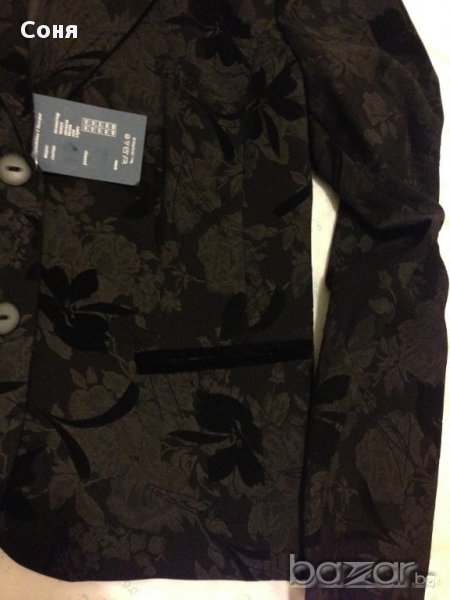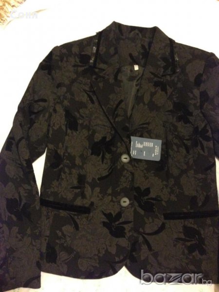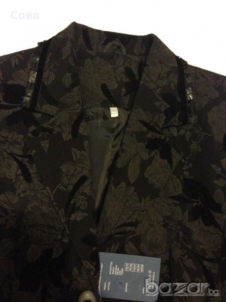 Сако с флорални мотиви и изчистен панталон.Сако с 2 копчета: 20% памук и 80% вискозаПо ревера обточен с черни паети и половин сантиметрова нишка кадифе.Джоб филетка обточен с кадифе.Дължина гръб: 57 см.Дължина ръкав: 62 см.Ширина рамене: 42 см.Ширина бюст: 104 см.Панталон черен, прав, 100% полиестер, мъжки джоб и филетка отзад.Коланче 4,5 см с гайки.Дължина от чатала: 82 см. Произведено в България.