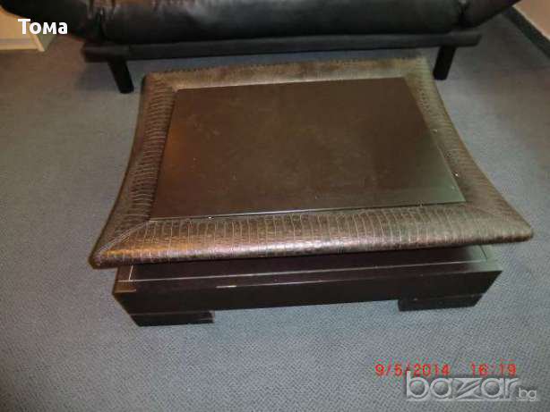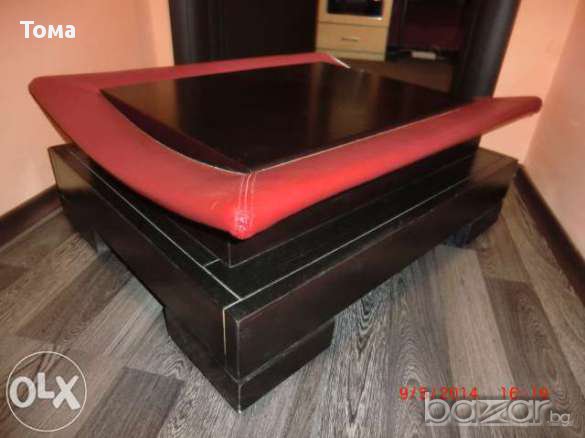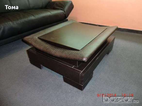 Масата е нова и много ефектна.Долната част е дърво а по края в горната част е кожа.Имам и в кафяво.Единствени .Уникати.
