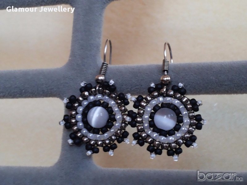 Обеците са ръчна изработка,с мънисто котешко око, японски мъниста тохо и метални кукички за обеци.Дължина 3,2 см.,диаметър на кръга 2 см.