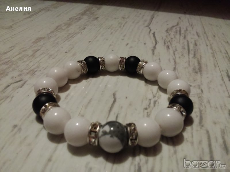 Уникална ръчно изработена гривна от естествени полускъпоценни камъни. Изработена от Жадеит /камъкът на активността, енергийния баланс/, Хаулит /камъкът предпазващ от негативни емоции и енергия/, черен Оникс /камъкът на щастието и самоконтрола/. Много подходяща за всички обичащи спорта. Постарах се да я снимам възможно най-реалистично, но на живо гривната е много по-изящна и красива. Изпращам с Еконт през сайта с 10% отстъпка. Може и със "Спиди".