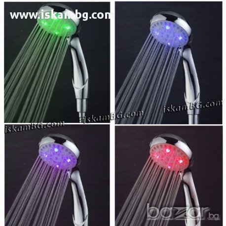 Светещ LED Душ слушалка, без батерии, свети в 4 цвята, Монтира се лесно и е съвместим със всички съвременни смесителни системи за душ. Осветява водата и тя прилича на светещ водопад, цветовете се менят непрекъснато, за разлика от другите LED слушаки, които светят в само в 1 цвят. Светлината се получава от налягането на водата и няма батерии и тн. В самата глава на слушалката има мини генератор, който от налягането се задвижва и създава достатъчно енергия, за да светят диодите.
