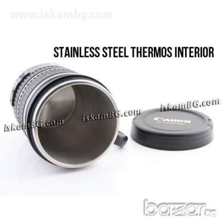 Доставете си истинско удоволствие с пиенето на сутрешното кафе. Дори една оригинална термос чаша е достатъчна, за да подобри настроението ви с различния си дизайн. Термос чашата е реалистична и повтаря познатата имитация на истински обектив Canon EF-S 17-55 mm. Сега обаче чашата разполага с удобна дръжка за по-добър захват. Изработката е наистина впечатляваща!