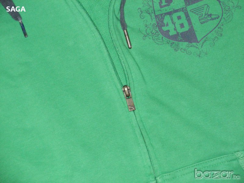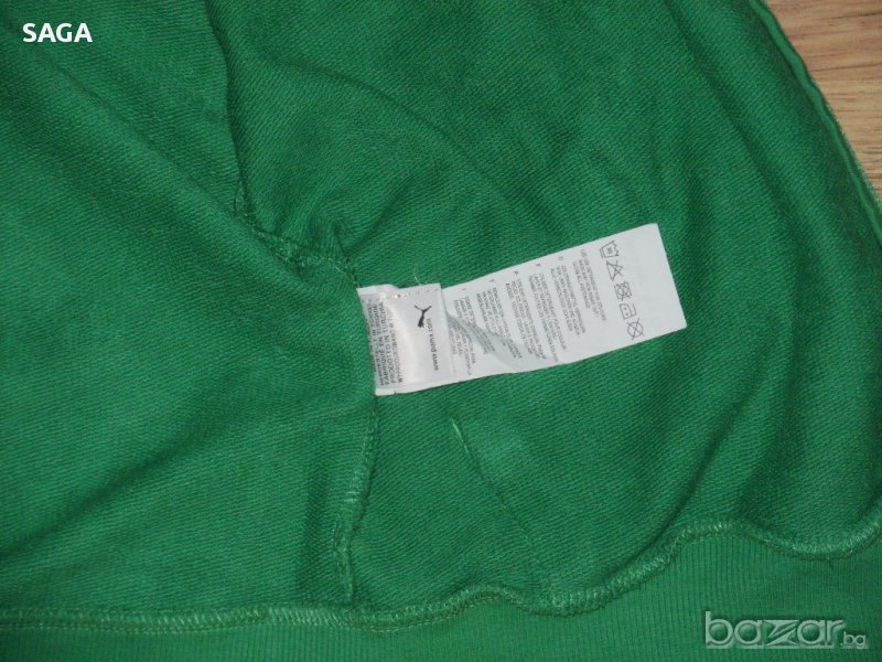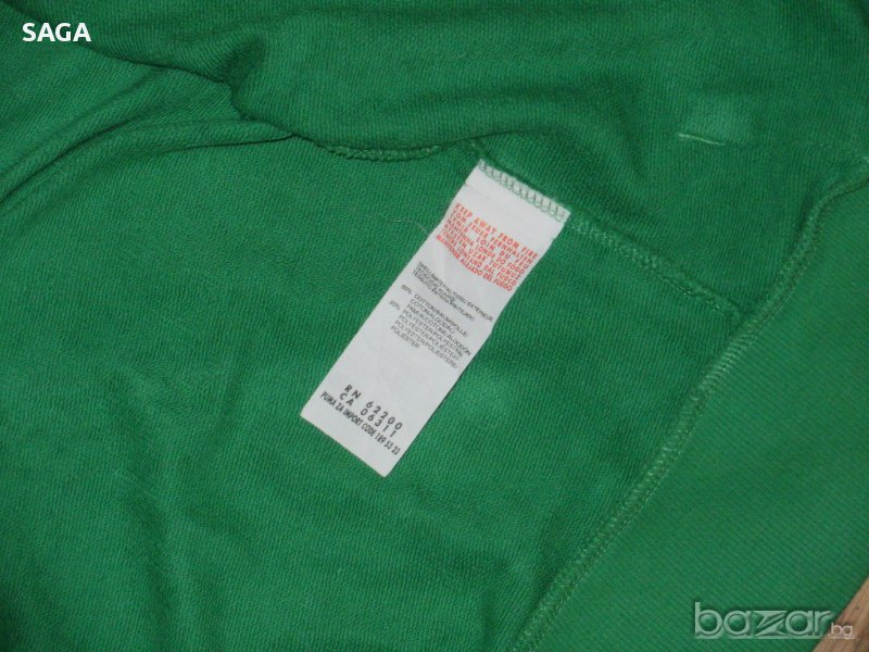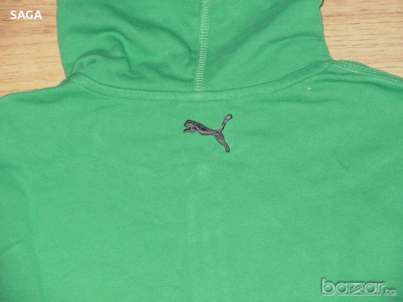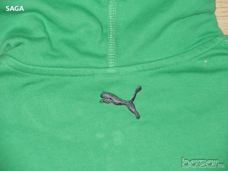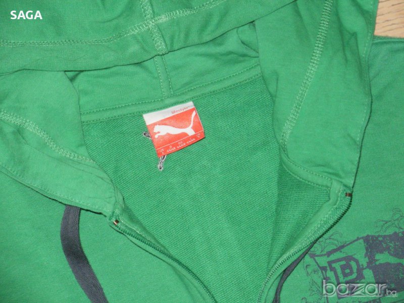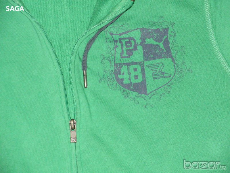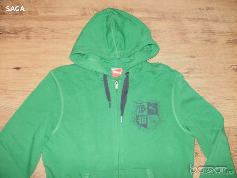 Суичъра е на PUMA оригинален, размер L. Обличан е два пъти и е изпран. Цвета е като на първа снимка. Много красиво зелено със сиво лого в горния край отпред и сива връзка на качулката, 100% памук. Закопчава се с цип, отпред има два джоба. Има лого отпред, на ципа, и отзад под качулката. Размери: дължина 67см, подмишници 56см, ханш 56см, ръкав 65/49см.