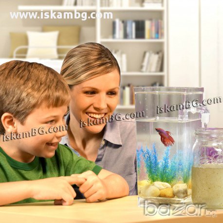 Решението е свежарски самопочистващ мини аквариум. Благадарение на системата за пречистване, съда се поддържа много лесно, без никакви сложни операции. Просто наливате чиста вода и замърсяванията се източват навън отаквариума. Вместимостта на съда е малко под 2л. Красивата LED лампа ще направи приказни обитателите на аквариума. Може спокойно да вземете „златната рибка” с вас дори и на лятната почивка, без да се притеснявате, че няма да има кой да се грижи за нея в къщи.