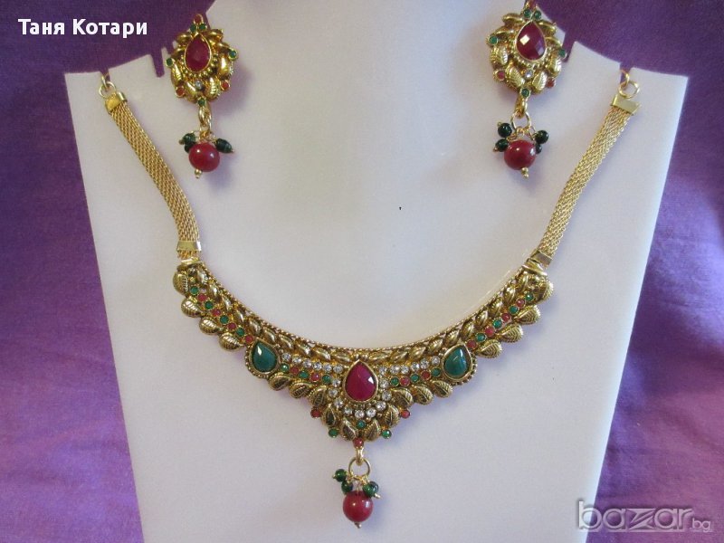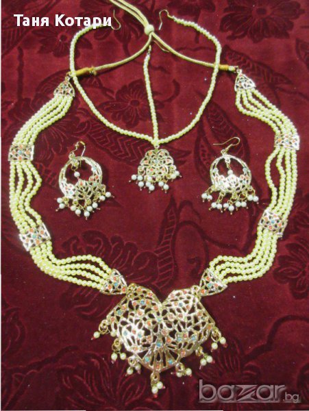 Ефектни бижута - имитации на индийски царски скъпоценности. Всички комплекти имат обеци, колие и украшение за глава - тика. Единични бройки