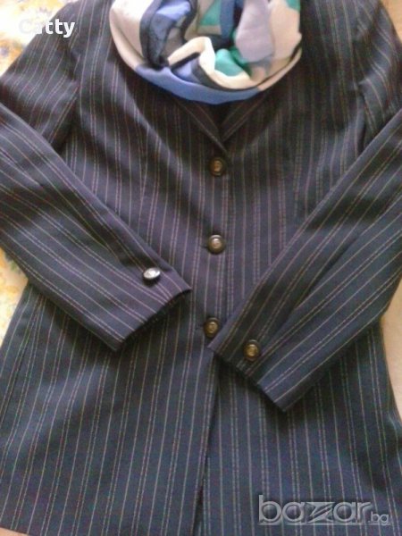 Дамско синьо сако с удължен силует, размер S, размери - 48см широчина, 72см дьлжина от рамото, 61см дьлжина рькав. Сакото е с подплата, българско производство!