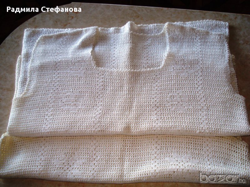 Блузи плетени на ръчно на една кука.Всяка по 13 лева. Цвят - бял3 броя якички по 15 лева.Плетени са ръчно.За размери пишете.