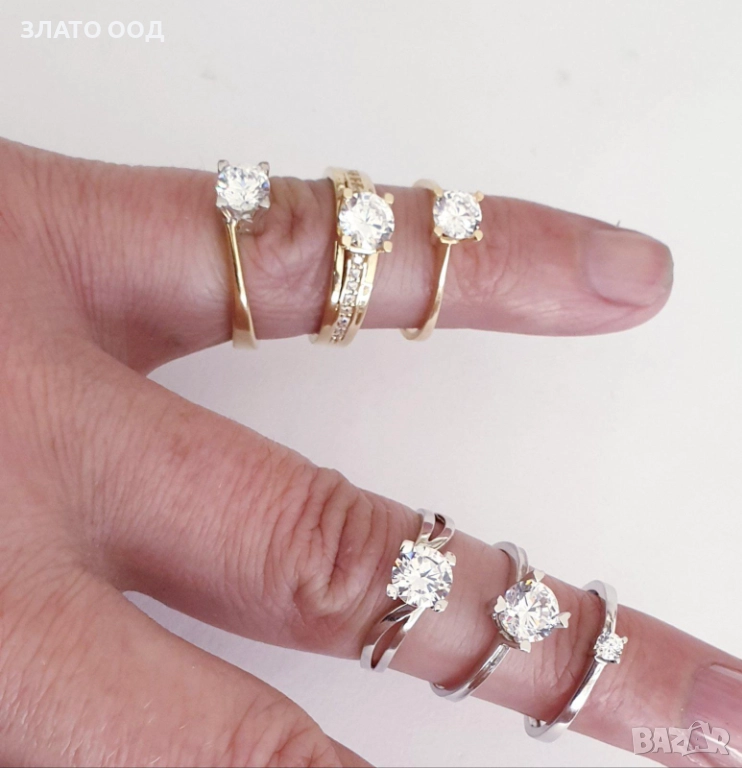 Налични и годежни пръстени с циркони от злато: бяло или жълто Au 585-14К с размери от 50-ти до 60-ти . Цени от 250 лв и нагоре.