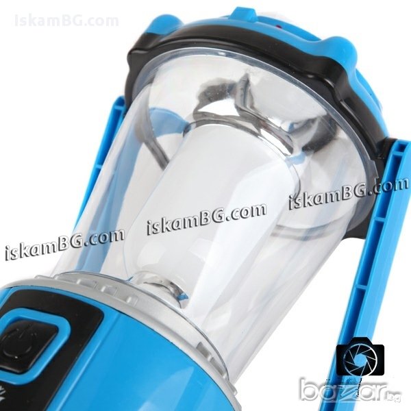 Светодиоден къмпинг фенер със соларна батерия, с две степени на осветеност - 12LED и 8 LED. Практичен и компактен, осигурява равномерно осветяване. Фенерът се зарежда от три източника - със слънчева енергия от слънчевата батерия, разположена отгоре, чрез вградено динамо, посредством сгъваема ръкохватка или чрез електрическа енергия от друг източник, с USB кабел /кабелът не е включен в комплекта/. С интелигентен контрол от чип. Фенерър е изработен от устойчива ABS пластмаса с водоотблъскващо покритие, разполага с прозрачен плексигласов предпазител на осветителната част, сгъваема дръжка.