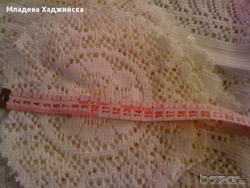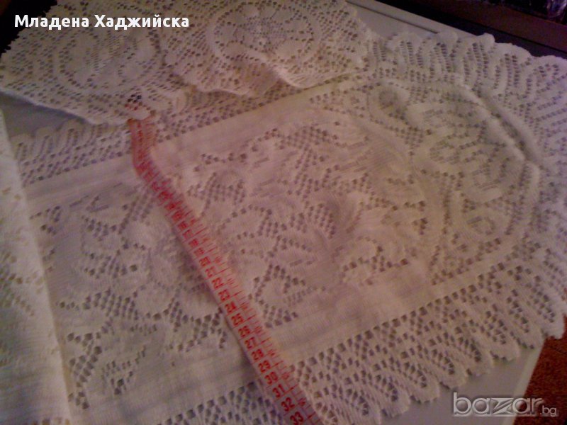 каре дълго 137 см, широко 33 см, от изкуствена материя, цвят слонова кост, ново, има и 2 бр. подложки за сервиране с диаметър 20 см към него.