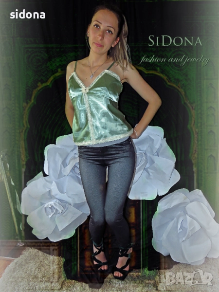 Сатенен потник.Изработен от сатенена материя в зелен цвят,декориран с нежна дантела. Наличен размер: М